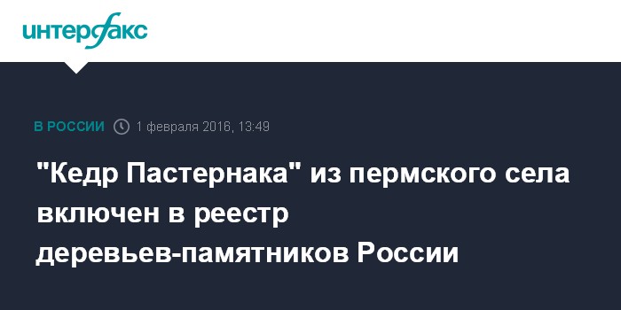 Москва. 1 февраля. INTERFAX.RU - Столетний кедр из села Всеволодо-Вильва (Пермский край), где располагается музей "Дом Пастернака", вошел в число деревьев-памятников России как объект, связанный с историей жизни русского писателя.