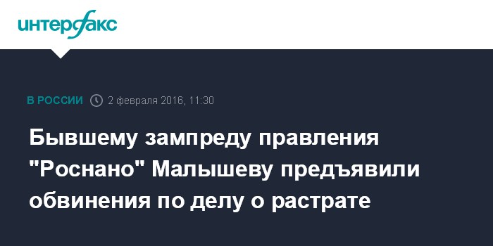 Москва. 2 февраля. INTERFAX.RU - Следствие заочно предъявило обвинение бывшему заместителю председателя правления "Роснано" Андрею Малышеву - третьему фигуранту делу о растрате более 220 млн рублей из средств корпорации.