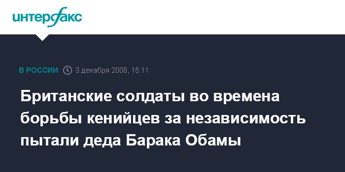 Москва. 3 декабря. INTERFAX.RU - Дед избранного президента США Барака Обамы был помещен британскими властями в тюрьму и подвергался пыткам в ходе жестокой борьбы за независимость Кении, утверждают кенийские родственники нового главы Белого дома.