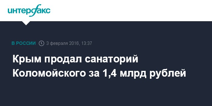 Москва. 3 февраля. INTERFAX.RU - Крым в среду продал на открытом аукционе санаторий "Форос", принадлежавший украинскому бизнесмену Игорю Коломойскому и затем национализированный, за 1,4 млрд рублей Федерации профсоюзов Республики Татарстан, передает корреспондент "Интерфакса".