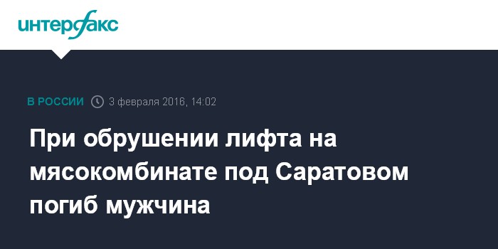 Москва. 3 февраля. INTERFAX.RU - Один человек погиб при падении лифта на мясоперерабатывающем предприятии в Саратовском районе Саратовской области в среду, сообщили "Интерфаксу" в региональном Центре медицины катастроф (ЦМК).