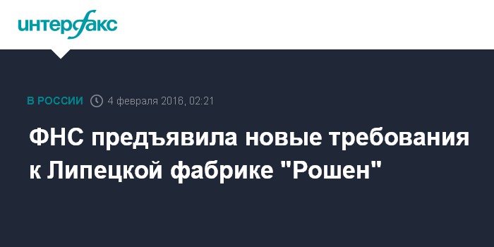 Москва. 4 февраля. INTERFAX.RU - Налоговые органы предъявили новые требования к Липецкой фабрике "Рошен" ("дочка" украинской корпорации Roshen, принадлежащей президенту Украины Петру Порошенко).