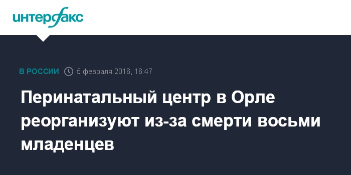 Москва. 5 февраля. INTERFAX.RU - Губернатор Орловской области Вадим Потомский подписал распоряжение о реорганизации перинатального центра в Орле, где в январе умерли восемь новорожденных.