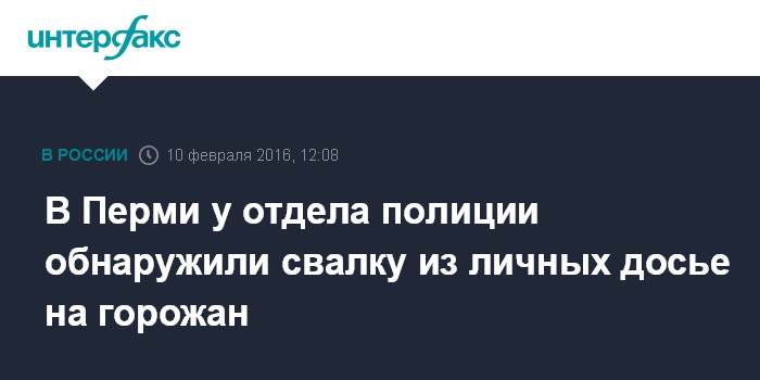 Москва. 10 февраля. INTERFAX.RU - Полиция Кировского района Перми начала внутреннюю проверку после обращения очевидцев, обнаруживших у здания районного ОВД разбросанные досье на горожан, сообщили "Интерфаксу" в пресс-службе регионального ГУ МВД.