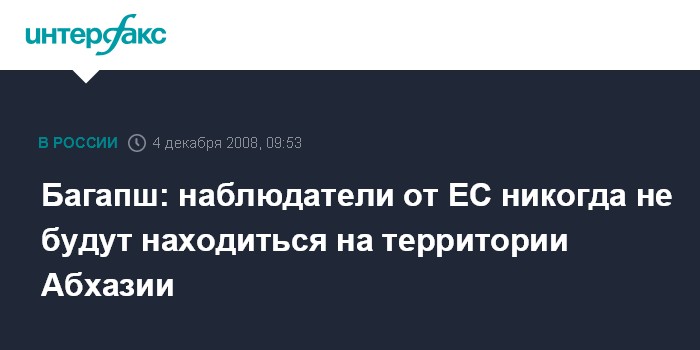 Отвечая на вопрос агентства, Багапш отметил, что "наблюдатели от ЕС никогда не будут выполнять свою миссию на территории Абхазии". "Это противоречит и соглашению Медведева - Саркози, согласно которому наблюдатели от ЕС должны находиться на территориях, прилегающих к Абхазии и Южной Осетии", - заявил президент.