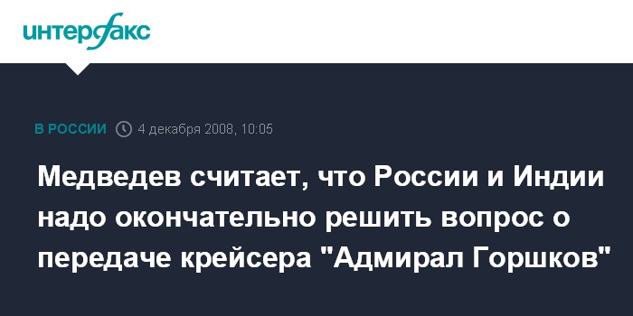 Москва. 4 декабря. INTERFAX.RU - Россия и Индия должны окончательно договориться по вопросу о передаче Индии авианесущего крейсера "Адмирал Горшков", заявил президент РФ Дмитрий Медведев.