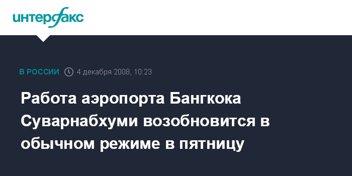Москва. 4 декабря. INTERFAX.RU - Международный аэропорт Бангкока Суварнабхуми войдет в обычный режим работы в пятницу, всего через 48 часов после того, как антиправительственные демонстранты сняли с него блокаду, сообщает в четверг агентство ЭФЭ.