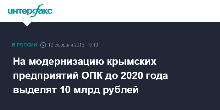 Москва. 12 февраля. INTERFAX.RU - До 2020 года на модернизацию крымских предприятий оборонно-промышленного комплекса запланировано выделение 10 млрд рублей, заявил зампредседателя коллегии Военно-промышленной комиссии РФ Олег Бочкарев.