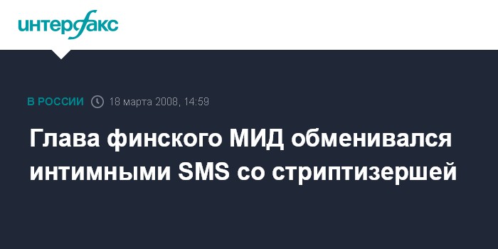 Лондон/Хельсинки. 18 марта. INTERFAX.RU - Министр иностранных дел Илкка Канерва признался, что посылал SMS-сообщения стриптизерше, сообщает лондонская газета Daily Telegraph, отмечая, что в общей сложности глава внешнеполитического ведомства отправил 29-летней танцовщице стриптиз-клуба Йоханне Тукиайнен около 200 посланий интимного содержания.