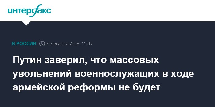 Москва. 4 декабря. INTERFAX.RU - Председатель правительства РФ Владимир Путин заявил, что массовых увольнений офицеров и прапорщиков в ходе перевода Вооруженных сил к новому облику не будет.