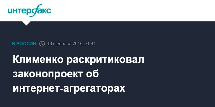 Москва. 16 февраля. INTERFAX.RU - Советник президента России по интернету Герман Клименко раскритиковал законопроект об интернет-агрегаторах.