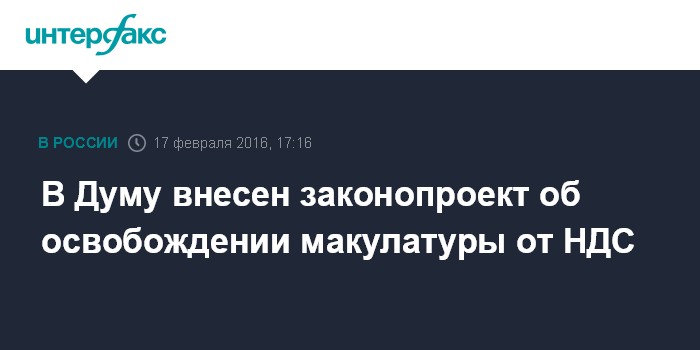 Москва. 17 февраля. INTERFAX.RU - В Госдуму внесен законопроект, предлагающий освободить от НДС реализацию макулатуры в РФ.
