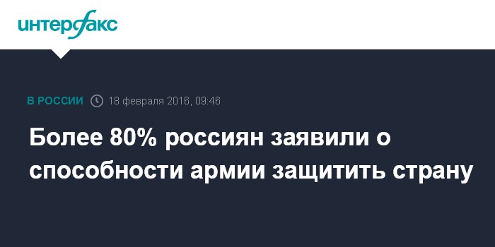 Москва. 18 февраля. INTERFAX.RU - Две трети россиян (65%) полагают, что сейчас для РФ существует военная угроза со стороны других стран (причем за последние два года этот показатель вырос на 9%), однако 81% верит в то, что армия способна защитить страну, сообщили "Интерфаксу" в "Левада-Центре".