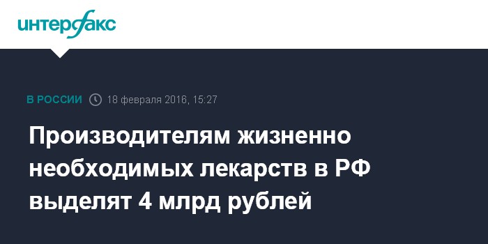 Москва. 18 февраля. INTERFAX.RU - Правительством в плане по поддержке российской экономики предусмотрено 4 млрд рублей на помощь фармпредприятиям, выпускающим лекарства из списка жизненно необходимых (ЖНВЛП), сообщил министр экономического развития РФ Алексей Улюкаев.