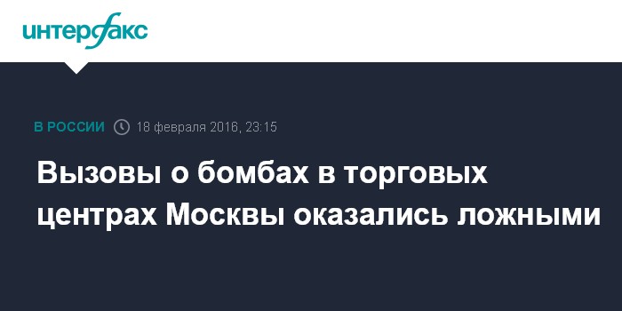 Москва. 18 февраля. INTERFAX.RU - Взрывных устройств в торговых центрах Москвы, о которых в правоохранительные органы по телефону сообщил неизвестный, не обнаружено, сообщили "Интерфаксу" в четверг в пресс-службе столичного главка полиции.