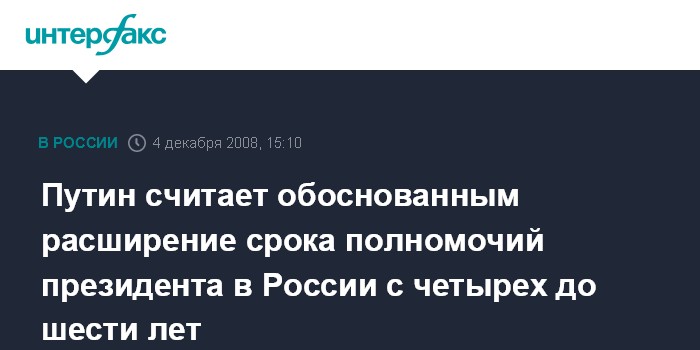 Москва. 4 декабря. INTERFAX.RU - Премьер-министр России Владимир Путин считает обоснованными предложения президент РФ Дмитрия Медведева об увеличении сроков мандатов президента и Госдумы.