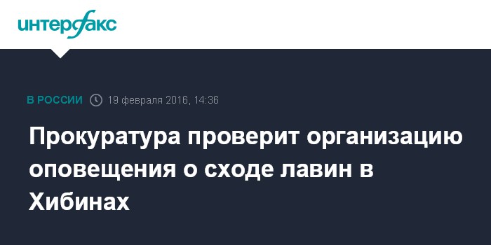 Москва. 19 февраля. INTERFAX.RU - Сотрудники прокуратуры проверят, как была организована система оповещения населения Кировска (Мурманская область) о сходе лавин, в время одной из которых погиб человек. Об этом "Интерфаксу" сообщила пресс-секретарь облпрокуратуры Эвелина Макарова.
