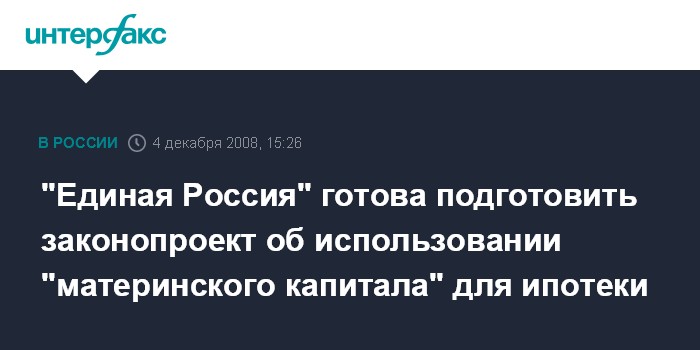 Москва. 4 декабря. INTERFAX.RU - Фракция парламентского большинства в Госдуме готова взять на себя инициативу подготовки законопроекта о возможности использования "материнского капитала" на ипотечные выплаты с 2009 года.