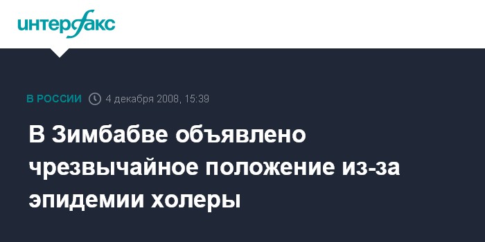 Москва. 4 декабря. INTERFAX.RU - Власти Зимбабве объявили в четверг о введении чрезвычайного положения из-за эпидемии холеры, в результате которой уже умерли более 550 человек, сообщает британская телерадиокорпорация Би-Би-Си.