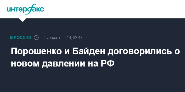Москва. 20 февраля. INTERFAX.RU - Президент Украины Петр Порошенко и вице-президент США Джозеф Байден в ходе телефонного разговора скоординировали действия по дальнейшему давлению на Российскую Федерацию, сообщает пресс-служба главы государства.
