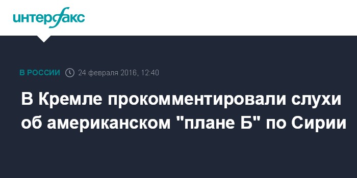 Москва. 24 февраля. INTERFAX.RU - Пресс-секретарь президента РФ Дмитрий Песков, комментируя наличие у США "плана Б" по сирийскому урегулированию, заявил, что в настоящее время Россия концентрируется на выполнении "плана А", обнародованного в понедельник Москвой и Вашингтоном.