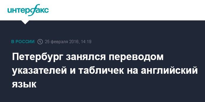 Москва. 25 февраля. INTERFAX.RU - В Санкт-Петербурге разрабатывается документ, который утвердит единые принципы транслитерации и перевода на английский язык названий городских объектов, сообщил глава городского комитета по культуре Константин Сухенко.