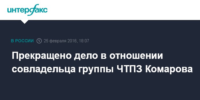 Москва. 25 февраля. INTERFAX.RU - Уголовное дело в отношении совладельца группы ЧТПЗ Андрея Комарова прекращено, говорится в сообщении Goltsblat BLP со ссылкой на партнера практики разрешения споров Рустама Курмаева, представлявшего интересы Комарова.