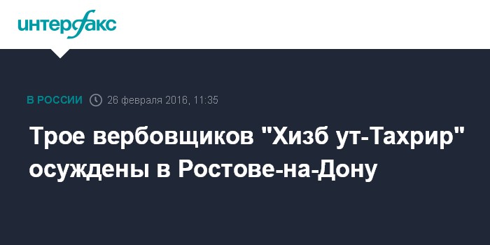 Москва. 26 февраля. INTERFAX.RU - Северо-Кавказский окружной военный суд вынес в пятницу обвинительный приговор трем фигурантам дела о вербовке в террористическую организацию "Хизб ут-Тахрир", деятельность которой запрещена в РФ, сообщил корреспондент "Интерфакса".