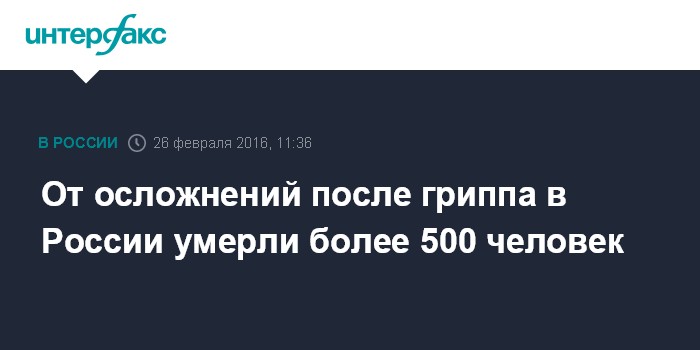 Москва. 26 февраля. INTERFAX.RU - Жертвами осложнений после гриппа в России стали 503 человека, заявил официальный представитель Минздрава Олег Салагай.
