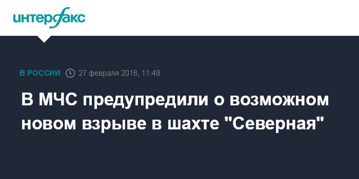 Москва. 27 февраля. INTERFAX.RU - На шахте "Северная" в Воркуте существует угроза повторного взрыва, сообщили в субботу в пресс-службе МЧС России.
