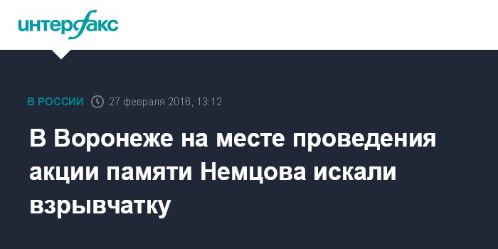 Москва. 27 февраля. INTERFAX.RU - Митинг памяти Бориса Немцова, который должен был пройти на Советской площади в Воронеже, перенесен в другое место из-за подозрительного автомобиля, который пришлось обследовать взрывотехникам.