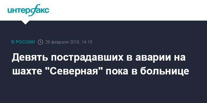 Москва. 28 февраля. INTERFAX.RU - Состояние девятерых пострадавших в результате аварии на шахте "Северная" в городе Воркута стабильное, сообщил официальный представитель Минздрава России Олег Салагай.
