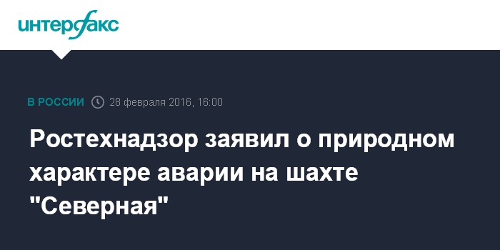 Москва. 28 февраля. INTERFAX.RU - Происшествие на шахте "Северная" в Воркуте имеет природный характер, сообщил в воскресенье глава Печорского отделения Ростехнадзора Александр Гончаренко.