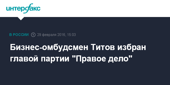 Москва. 29 февраля. INTERFAX.RU - Бизнес-омбудсмен Борис Титов избран новым председателем партии "Правое дело", передает корреспондент "Интерфакса" с проходящего в Москве съезда партии.