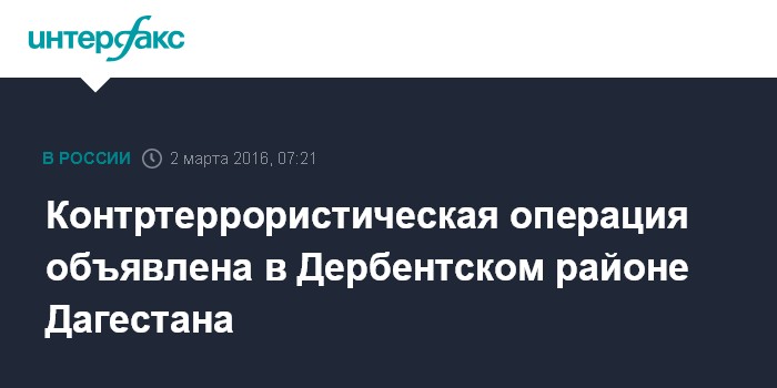 Москва. 2 марта. INTERFAX.RU - Правовой режим контртеррористической операции (КТО) введен на территории Дербентского района Дагестана, сообщили агентству "Интерфакс" в оперативном штабе пресс-службы Дагестана.