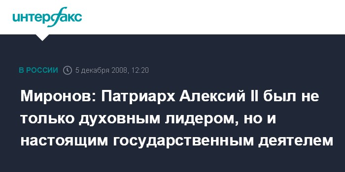 "Это невосполнимая потеря для всех православных русских людей, где бы они ни проживали", - сказал журналистам Миронов. При этом он подчеркнул, что всегда, "когда встречался с Алексием, то говорил с патриархом не только как с духовным наставником, но и как с настоящим государственным деятелем, которого волновали все проблемы - будь то экономические, социальные или внешнеполитические". Спикер выразил соболезнование всем православным в связи со смертью Патриарха. "И еще невозможно осознать, что патриарха больше нет", - сказал он.