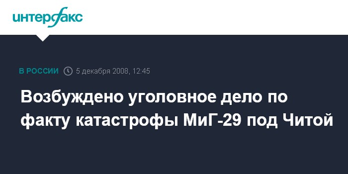 Москва. 5 декабря. INTERFAX.RU - По факту крушения самолета МиГ-29 в Забайкальском крае возбуждено уголовное дело по статье "Нарушение правил полетов или подготовки к ним", сообщили "Интерфаксу" в Следственном комитете при прокуратуре СКП РФ. Там отметили при этом, что "проведение первоначальных следственных действий осложняет сильный мороз - температура в Чите опустилась до минус 38 градусов".