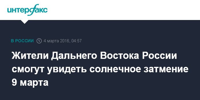 Москва. 4 марта. INTERFAX.RU - Жители Дальнего Востока единственные в России смогут увидеть одну из фаз полного солнечного затмения 9 марта 2016 года, сообщил Московский планетарий.