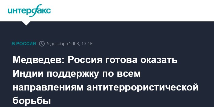 Москва. 5 декабря. INTERFAX.RU - Президент РФ Дмитрий Медведев заявил, что Россия готова оказать Индии "всю необходимую поддержку по всем направлениям борьбы с терроризмом".