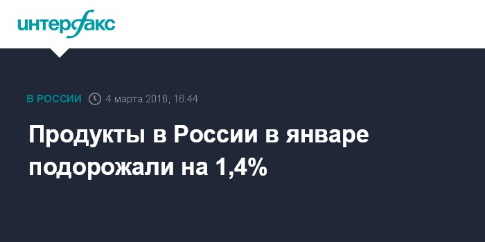 Москва. 4 марта. INTERFAX.RU - Рост цен на продукты питания в РФ за январь составил 1,4%, в то время как в ЕС продовольствие стало дороже всего на 0,2%, следует из обзора Федеральной службы госстатистики (Росстат).