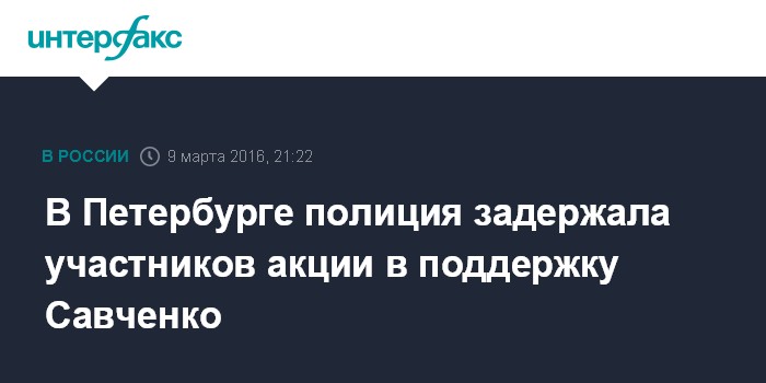 Москва. 9 марта. INTERFAX.RU - Несколько участников несанкционированной акции в поддержку Надежды Савченко в центре Петербурга доставлены в отделение полиции, сообщил один из организаторов мероприятия Всеволод Нелаев "Интерфаксу" в среду.