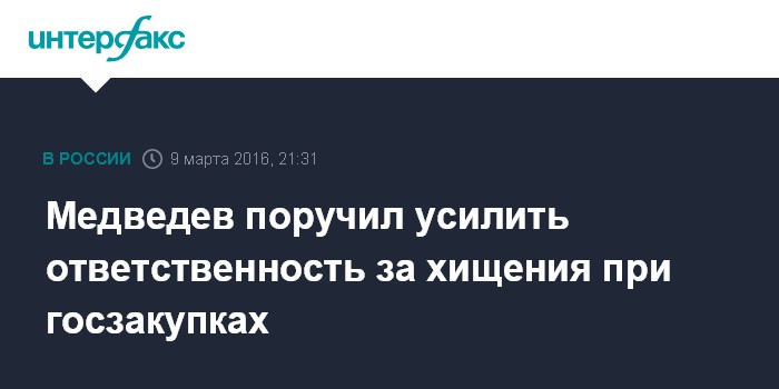 Минюсту России, Минэкономразвития, Минфину и ФАС России "представить в установленном порядке предложения по внесению в законодательство Российской Федерации изменений, предусматривающих усиление уголовной ответственности и повышение эффективности других механизмов предотвращения хищений при осуществлении закупок товаров, работ, услуг для обеспечения государственных и муниципальных нужд", говорится в тексте поручений Медведева, размещенном на сайте.
