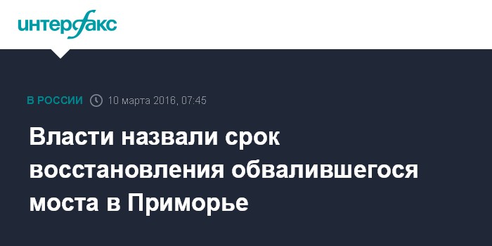 Москва. 10 марта. INTERFAX.RU - Директор департамента транспорта и дорожного хозяйства Приморья Александр Швора заявил, что на проектирование и строительство нового моста на месте рухнувшего через реку Литовка на трассе Владивосток-Находка уйдет около двух лет.