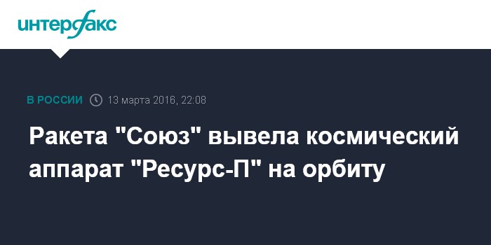 Москва. 13 марта. INTERFAX.RU - Космический аппарат "Ресурс-П" №3 отделился от третьей ступени ракеты-носителя "Союз-2.1б" и успешно вышел на орбиту, сообщил "Интерфаксу" источник в Роскосмосе.
