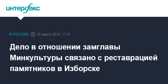 "Уголовное дело и задержание одного из заместителей министра связано в первую очередь с реставрацией памятников истории и культуры в Изборске - в частности, Труворова городища, Никольской церкви, Никольского собора и других", - заявил источник "Интерфаксу" во вторник.