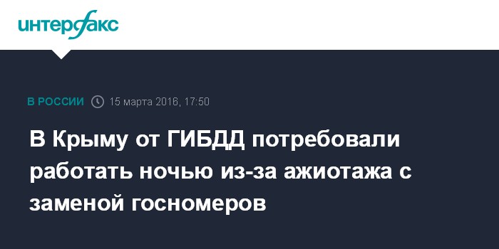 Москва. 15 марта. INTERFAX.RU - Прокуратура Крыма требует от ГИБДД работать ночью и привлечь дополнительные силы из-за ажиотажа с перерегистрацией украинских автомобильных номеров на российские, срок которой, согласно постановлению правительства России, заканчивается 1 апреля, сообщила во вторник пресс-служба надзорного ведомства.