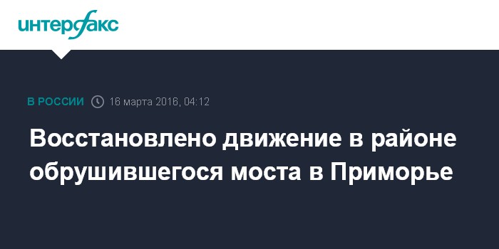 23 февраля обрушились два пролета моста через реку Литовка в Партизанском районе Приморья. Ущерб превысил 30 млн рублей. Региональные власти полагают, что ЧП произошло по вине водителя слишком тяжелого большегруза, вес которого мост не выдержал. В то же время начальник УМВД РФ по Приморью Николай Афанасьев заявлял, что мост мог рухнуть не по вине грузовика, а из-за плохого технического состояния конструкции или подвижки грунта.