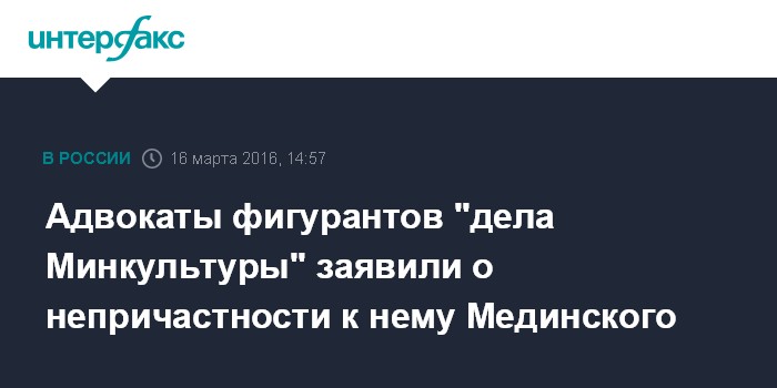 Москва. 16 марта. INTERFAX.RU - Защита фигурантов "дела Минкультуры", подозреваемых в хищении госсредств на реконструкцию памятников культурного наследия, заявила, что глава ведомства Владимир Мединский не имел отношения к госконтрактам.