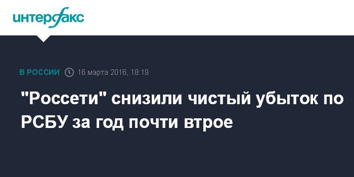 Москва. 16 марта. INTERFAX.RU - ПАО "Россети" зафиксировало чистый убыток по РСБУ за 2015 год в размере 18,2 млрд руб., что почти в три раза ниже аналогичного показателя 2014 года, следует из отчетности компании.