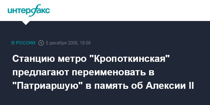 "Принимая во внимание несомненные заслуги перед Россией покойного патриарха Алексия и учитывая близость патриаршей резиденции в Чистом переулке, предлагаем переименовать столичную станцию метро "Кропоткинская" в "Патриаршую", - заявил корреспонденту "Интерфакс-Религия" (www.interfax-religion.ru) председатель движения Юрий Бондаренко. Он также указал на то, что станция "Кропоткинская" находится не только близ патриаршей резиденции, но и рядом с кафедральным собором Христа Спасителя.